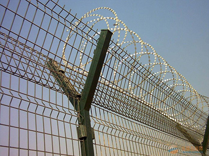 監獄防護網主要是采用高強度的刀片刺網與普通防護網的結合,V型支架立拄,加強型焊接片網,安全防盜連接件和刀片刺網組成.刀片刺網是一種新型防護網,由銳利尖角鍍鋅鋼板或不銹鋼薄板做刀片,鋼絲做芯線組合而成的防護器材。